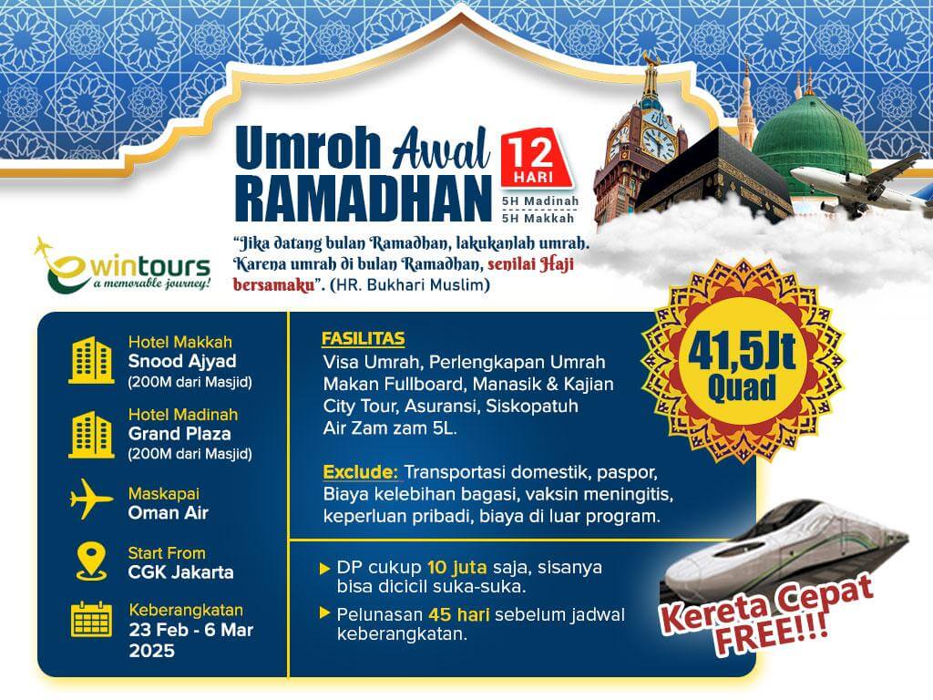 - Pendaftaran yang dilakukan 30 hari sebelum keberangkatan hanya dapat dilakukan jika langsung dibayar lunas dan mengikuti harga & ketersediaan seat pesawat, seat bus, serta kamar hotel di makkah & madinah.